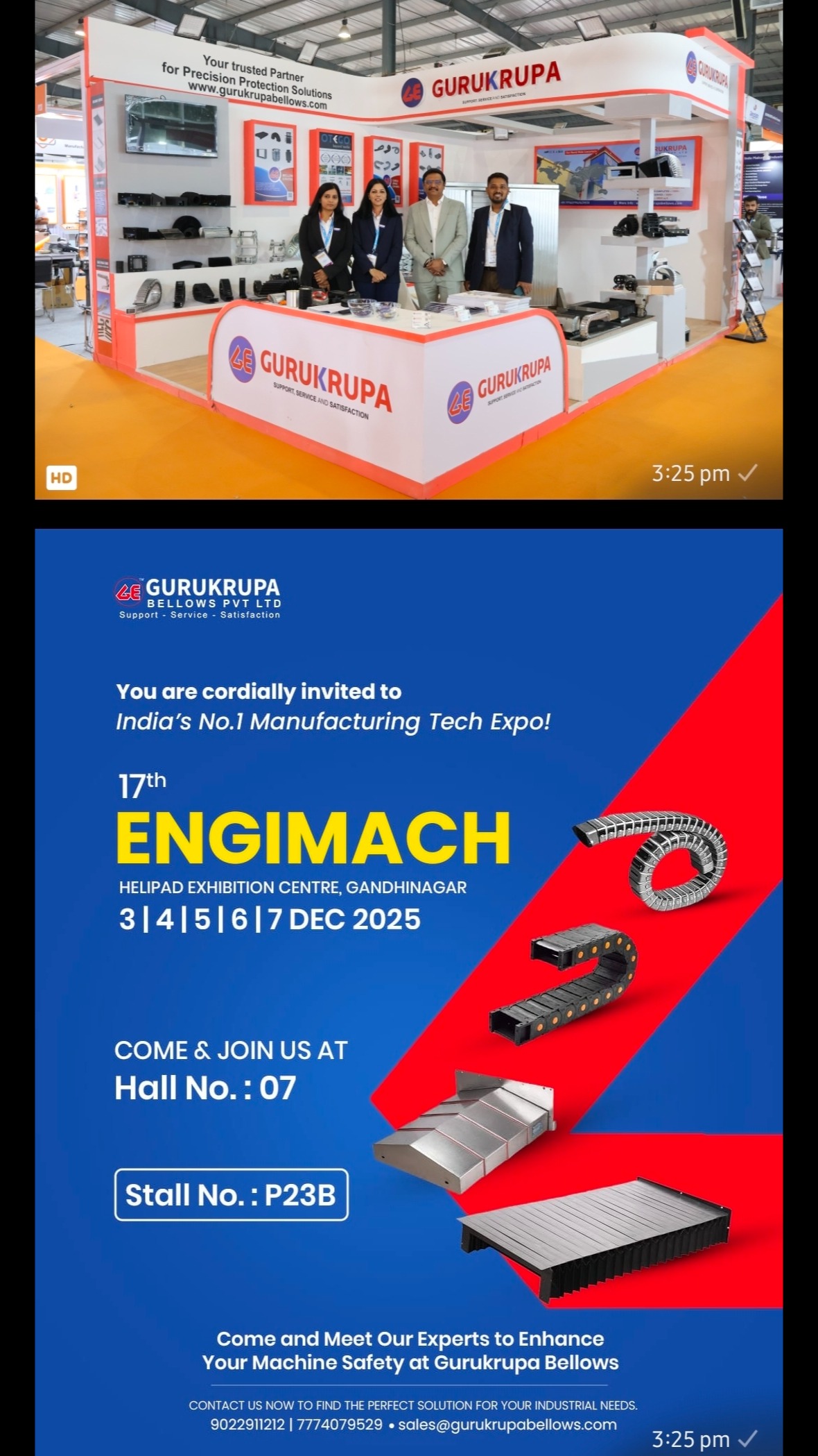 Gurukrupa Bellows announcing their participation as an exhibitor at the ENGIMACH 2025 trade show. They invite attendees to visit their stall to explore machine safety and industrial protection solutions.